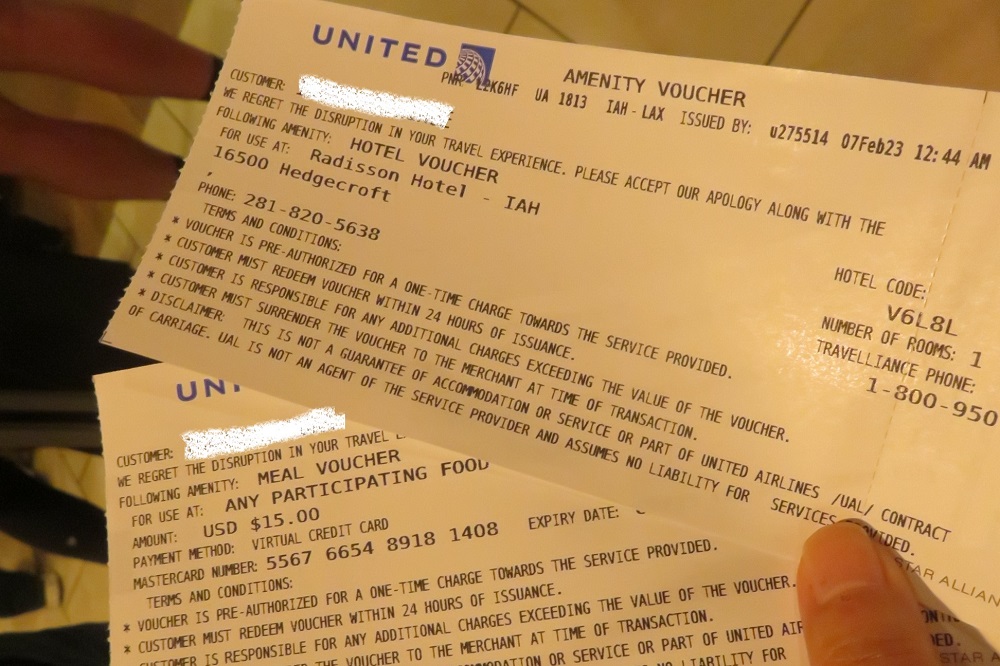 ・ミールバウチャー(1人当たり15㌦が2枚で30㌦。たしか使用期限が24時間以内でアメリカ国内どこの空港でも使えます。飲食店でも売店でも可だけど食品に限る。)