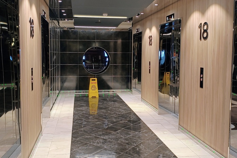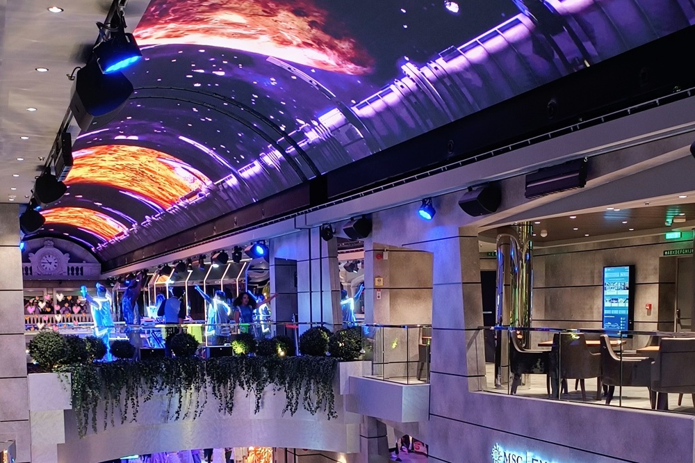 MSCクルーズのアイコン的なLEDの映像が見飽きないプロムナードやアトリウムの階段など。