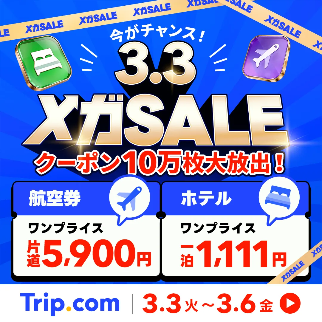 最もおトクな4日間 Trip.comのメガSALE 年に数回の特別なチャンス Trip.comのメガSALE 行きたかったあの場所も、泊まりたかった憧れホテルも、おトクな航空券も 有名パークのチケットも 今だけのセールが盛りだくさん! 次の...